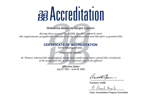 Referencia Banco de Sangre, cuenta con la acreditación internacional AABB (Asociación Americana de Bancos de Sangre). Esta acreditación garantiza nuestro compromiso en proveer al paciente un servicio y producto de alto nivel.